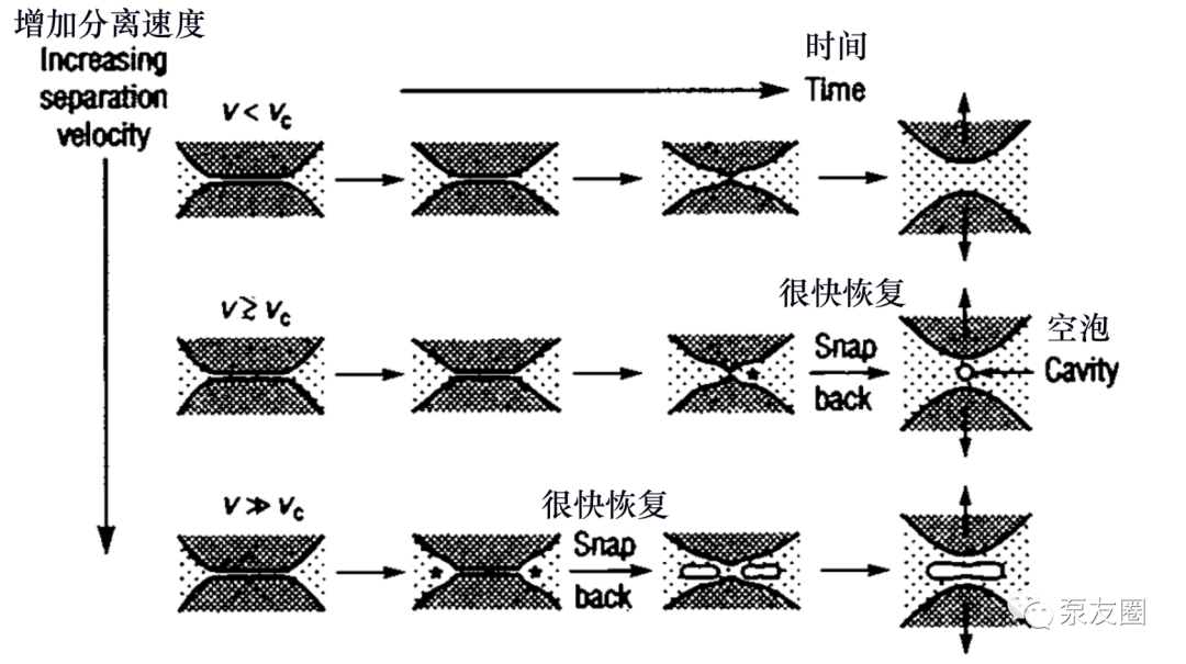 剛剛描述的過程表明,在足夠高的分離速度下,兩個接觸表面沒有足夠的時間從它們最初的彎曲或扁平狀態(tài)彈性釋放——即使它們沒有接觸而是被非常薄的液體膜隔開。因此,在距中心有限的徑向距離處達(dá)到最大負(fù)壓,并且在此處,表面突然反彈(反沖),形成空泡(但不一定破裂),并發(fā)生損壞。